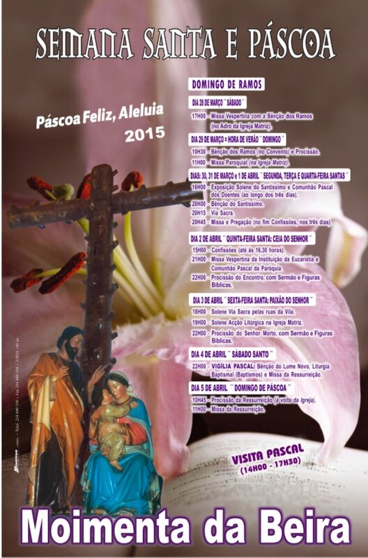 A Semana Santa em Moimenta da Beira começa já este sábado, 28 de março, com a Missa Vespertina e a Bênção dos Ramos no adro da Igreja Matriz. Prossegue no domingo, “Domingo de Ramos”, com procissão e missa, e durante a Semana Santa, os destaques vão para a Via Sacra, sexta-feira, 3 de abril, com início às 18 horas; para a Vigília Pascal, no sábado, 4 de abril (22 horas); e para o domingo de Páscoa, último dia, com a Procissão da Ressurreição (à volta da igreja), às 10h45, seguida da missa, às 11 horas e por fim a Visita Pascal.