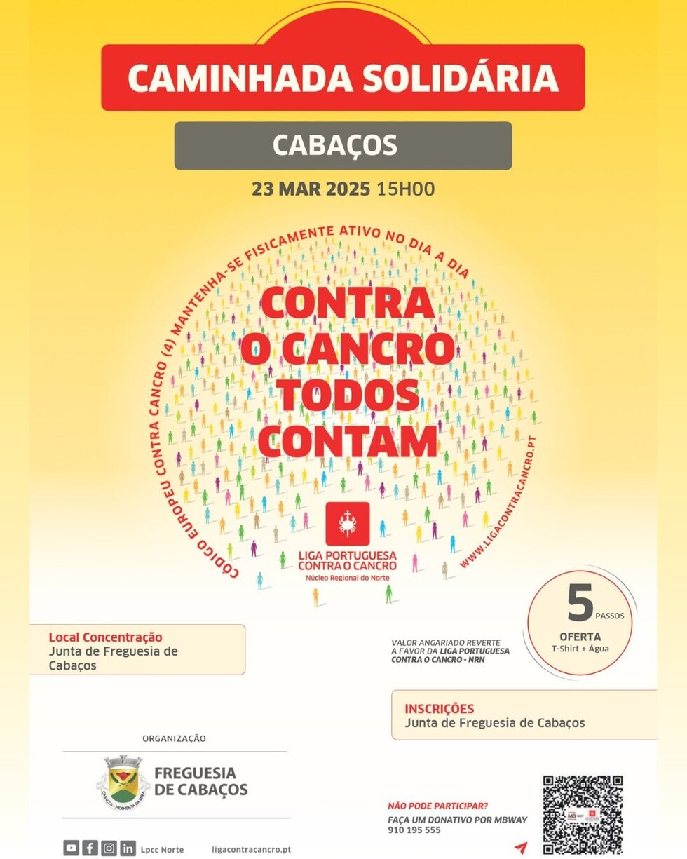 A Junta de Freguesia de Cabaços vai dinamizar, no dia 23 de março, uma Caminhada Solidária a favor da Liga Portuguesa contra o Cancro (LPCC). A atividade terá início às 15 horas, no Largo do Paço, junto ao edifício da junta freguesia.